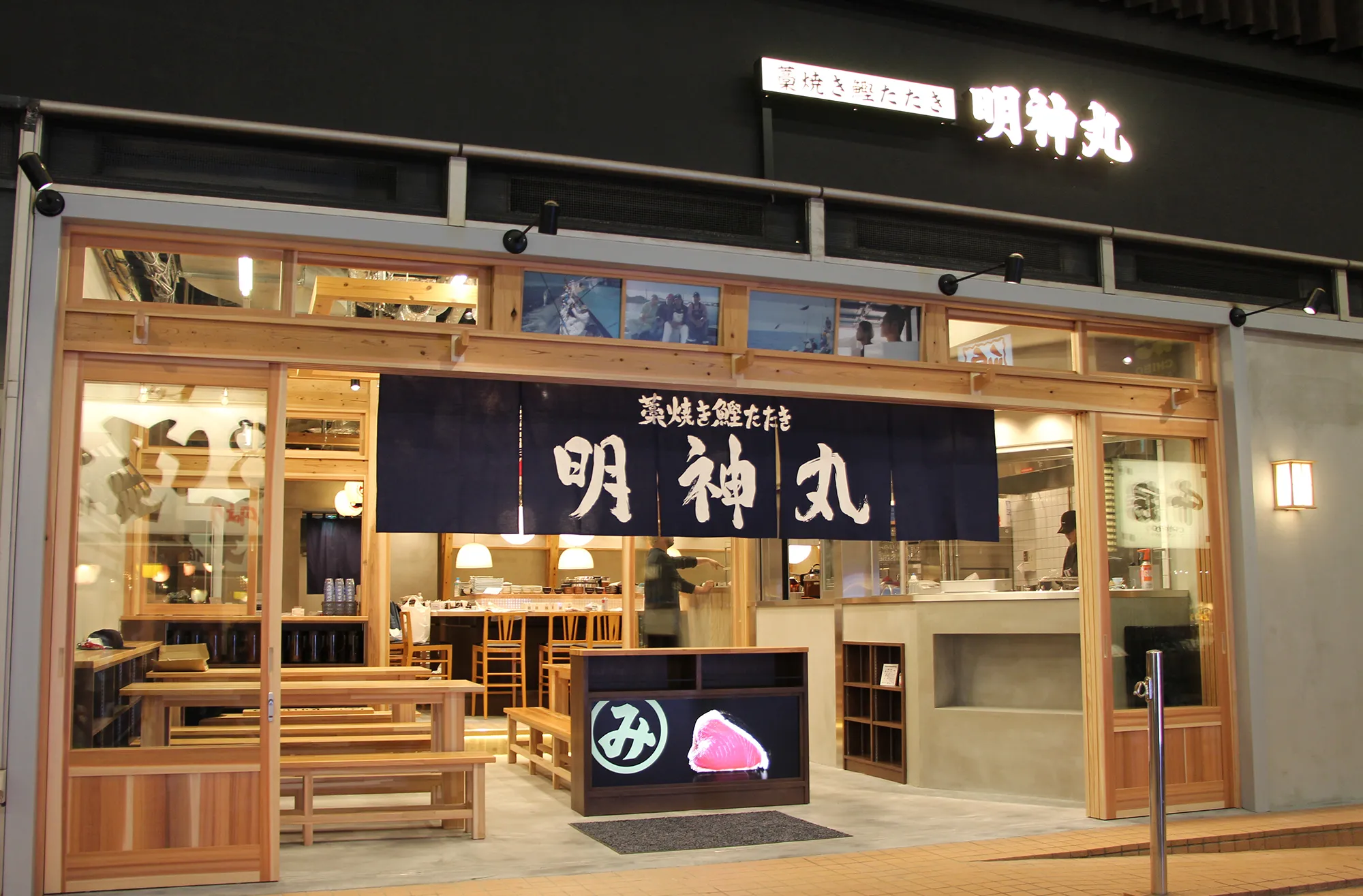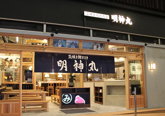 高知・ひろめ市場をモチーフにしたオープン席からは、名物「藁焼き」のライブパフォーマンス、店内は臨場感あるカウンター席やゆったり過ごせるテーブル席も完備。